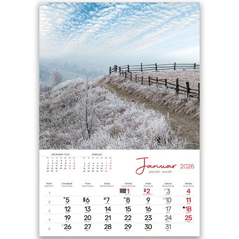 3,99 € + DDV13 listov, podložni karton, 135g premazni gloss papir, spiralna vezava, priložena natron vrečka, trimesečni, trijezični (SLO,ANG, NEM), označeni slov. in tuji prazniki, imena, lune, tedni,