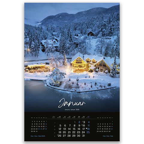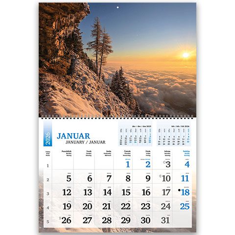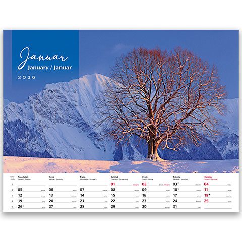 3,85 € + DDV13 listov, podložni karton, 135g premazni gloss papir, spiralna vezava, priložena natron vrečka, trimesečni, trijezični (SLO,ANG, NEM), označeni slov. in tuji prazniki, imena, lune, tedni,