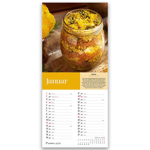 3,95 € + DDV13 listov, podložni karton, 135g premazni gloss papir, spiralna vezava, priložena natron vrečka, trimesečni, trijezični (SLO,ANG, NEM), označeni slov. prazniki, lune, tedni,