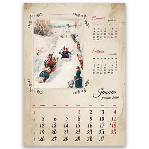 7,49 € + DDV13 listov, podložni karton, 150g antique rough papir, spiralna vezava, priložen prozorni PVC ovoj, trimesečni, označeni slov. prazniki, imena, lune, tedni,