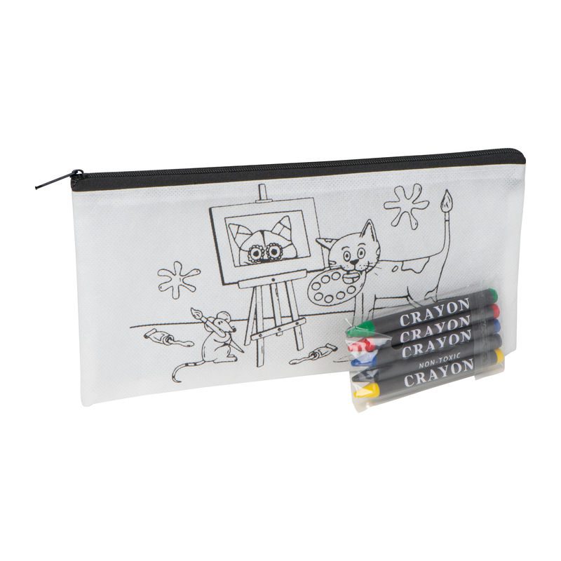 peresnica iz netkana – nonwoven materiala s petimi voščenimi barvicami (rumena, črna, modra, rdeča in zelena), natisnjena z otrokom prijaznim motivom za barvanje,