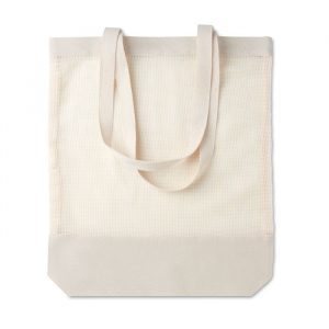 Vreča za hrano iz mrežastega RPET -a s sprednjim žepom in belo vrvico iz PP -ja na vrhu.